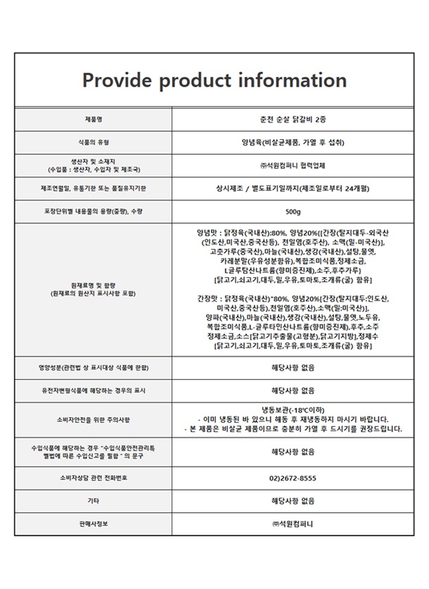 춘천 순살닭갈비 간장맛 / 양념맛 (1팩 500g)