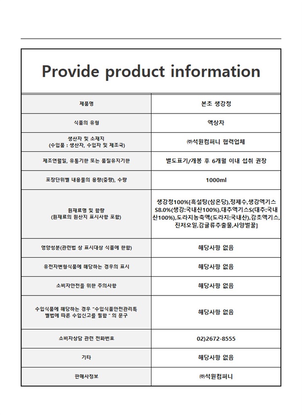 100% 국내산 재료로 만든 명품 생강청