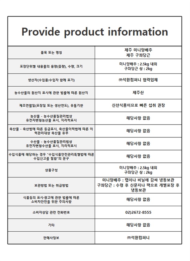 미니양배추 : 2.5kg 내외/ 구좌당근 상 : 2kg