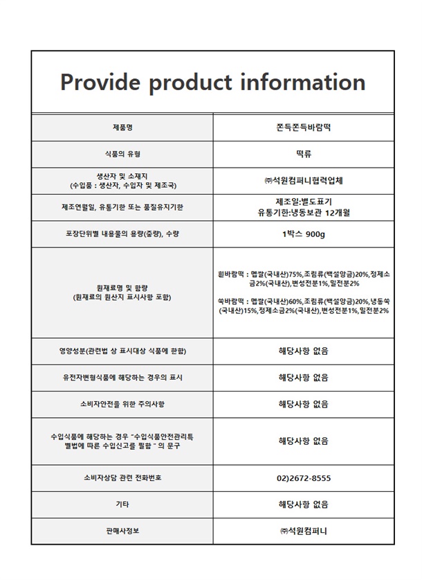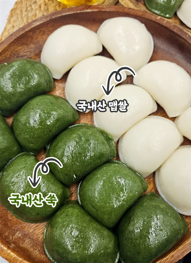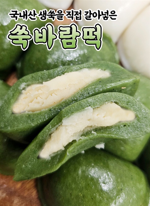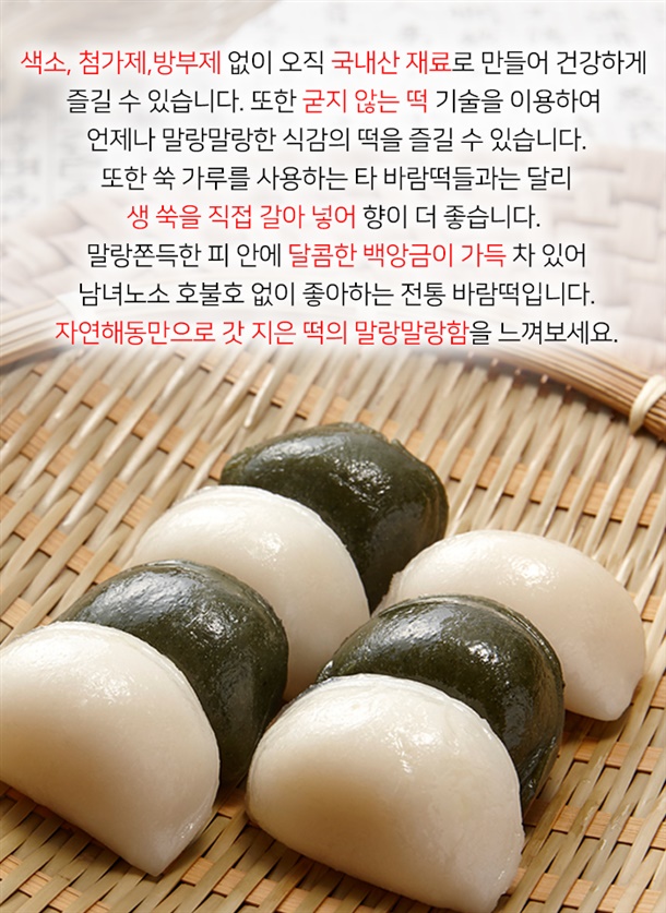 멥쌀(국내산)60%,조림류(백설앙금)20%,냉동쑥(국내산)15%,나머지는 흰바람떡과 동일
