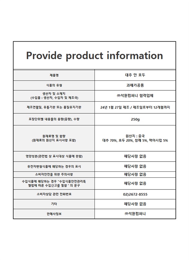 대추 70%, 호두 20%, 참깨 5%, 맥아시럽 5%