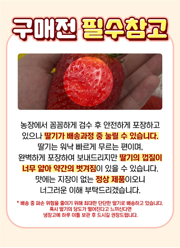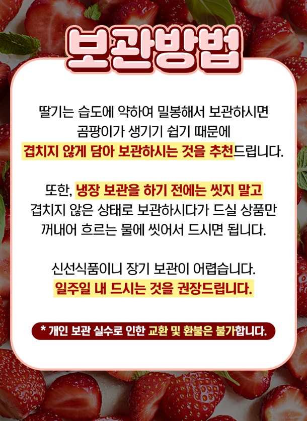 습도에 약하기 때문에 밀봉 후 딸기의 꼭지를 떼지 않고 냉장보관